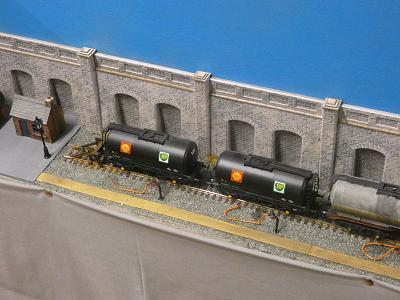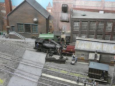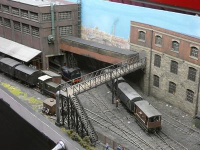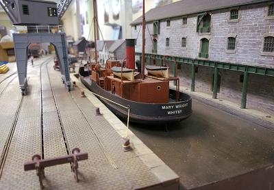 East Dock is a 4mm scale, EM gauge layout built by long time Abingdon Model Railway Club (ADMRC) member Alan Goode. Alan was acknowledged by the members of the ADMRC as one of their most skilled modelers. The whole model from the baseboards to the delightful little locomotives and rolling stock were designed and built with the thoughtful precision that Alan exuded in everything he did and it is a privilege to be able to exhibit East Dock in his memory. The layout is set in the period circa 1936 and represents one corner of a much larger dock complex somewhere in the Goole/Selby area of Yorkshire. Both the London Midland and Scottish (LMS) and the London North Eastern Railway (LNER) operated there, using tracks or running powers inherited from their pre-grouping predecessors. The locomotives are mostly kit built, with their chassis modified to in corporate compensation to improve both running and electrical pick-up. The other rolling stock is mostly kit built and is biased towards the specialist dock traffic. Most of the buildings are of plasticard embossed stone or brick on a balsawood or foamboard core. They include the original stone buildings and perimeter wall constructed by the dock company, and the scene is set by scratch-built "dirty British coaster" in the dock. | |