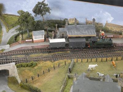 Hollow Fosse is a fictitious location in the south-west of the Cotswolds region. The layout represents a small rural branch line that connects with the former Midland and South Western Junction Railway. After being absorbed into the Great Western Railway (GWR) is still provided a useful link between the midlands and the south coast. Nationalisation allowed the mainline and its branches to settle into the slow rhythm of the countryside that it served. The layout endeavours to recreate the atmosphere of the late 1950's and early 1960's. The buildings many of which are modelled on actual structures, depict a typical Cotswold location. Locomotives and rolling stock are still a mixture of previous railway groups, GWR (Western), Southern and Midland including mixed trains which rationalised train movements. The layout which is L shaped has a dimensions of 5 feet by 3 feet and is operated from the rear of the 5 feet length. It is modelled on a 3mm to 1 foot scale, Triang TT. | |