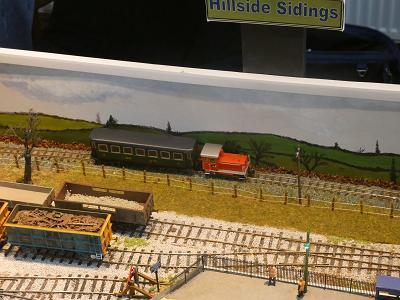 Hillside Sidings The layout has been converted from a test track, previously used for automated control. There is a single preserved heritage railway line at the rear, controlled by a shuttle module. This has automatic operation allowing two trains to occupy the line at any one time, alternately. Narrow gauge 009 scale. The front part of the layout represents a modern clay single line railway with a small station and storage sidings. This line is constructed to P4 standards fine scale. | ![]() ![]() | |